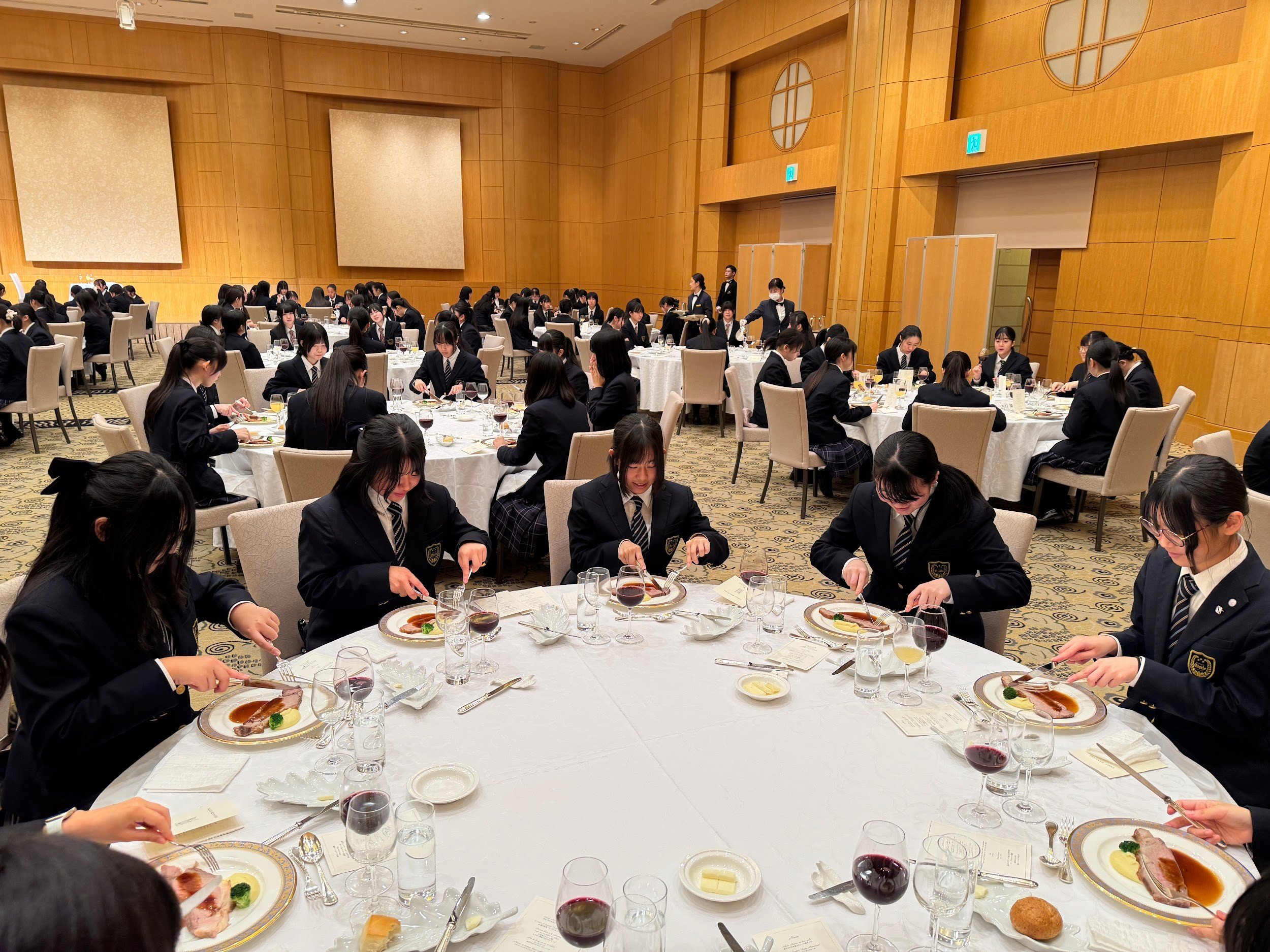 生徒の乾杯の音頭から始まり、ナプキンやナイフ・フォークの使い方、前菜、スープなどといったそれぞれの食事のマナーについて学びました。また食事のマナーだけでなく、相手に対する思いやりの心を持つことを教えていただきました。