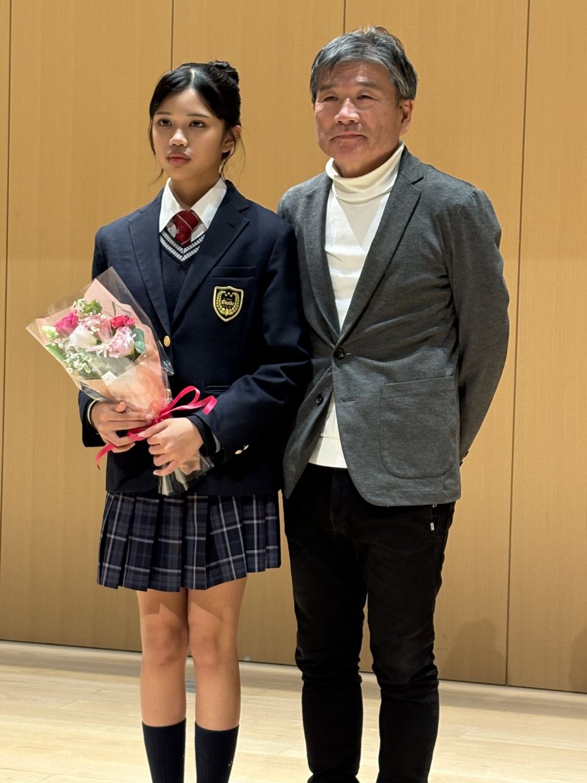 非常にハイレベルなコンテストで素晴らしい成果を挙げられたことに国際キャリアコースのみならず、学校全体が喜びの声をあげています。特に個別にアドバイス等のサポートをしてきた先生方(写真右:国際キャリアコース長)もS.Rさんの努力を知っている分、喜びはひとしおの様子でした。