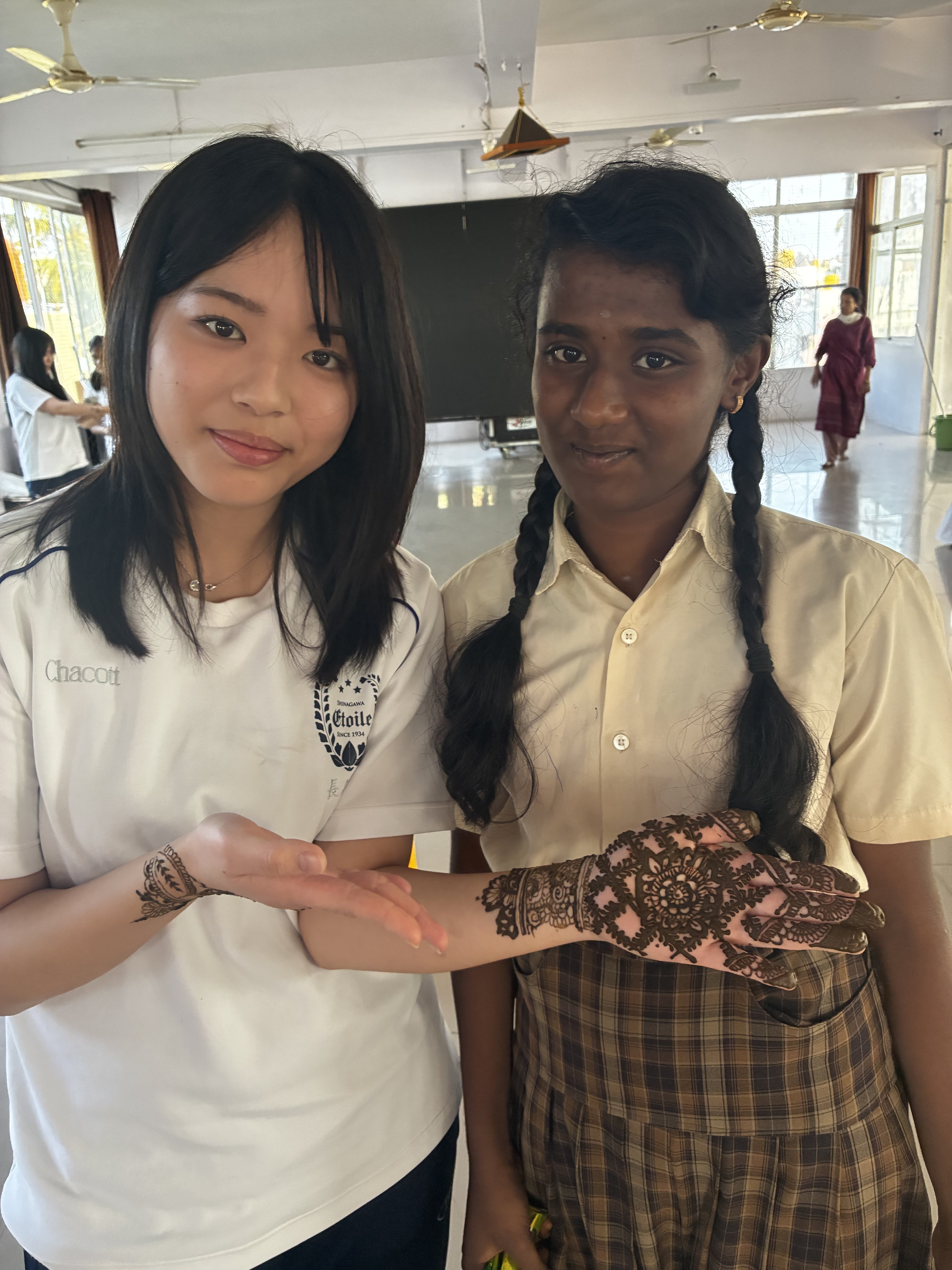また、翌日に行われるサンクランティというお祭りに向けて、インドの生徒たちにヘナタトゥーを施してもらいました。遅い時間まで丁寧に対応してくれたことに、生徒たちは感謝の気持ちでいっぱいの様子でした。